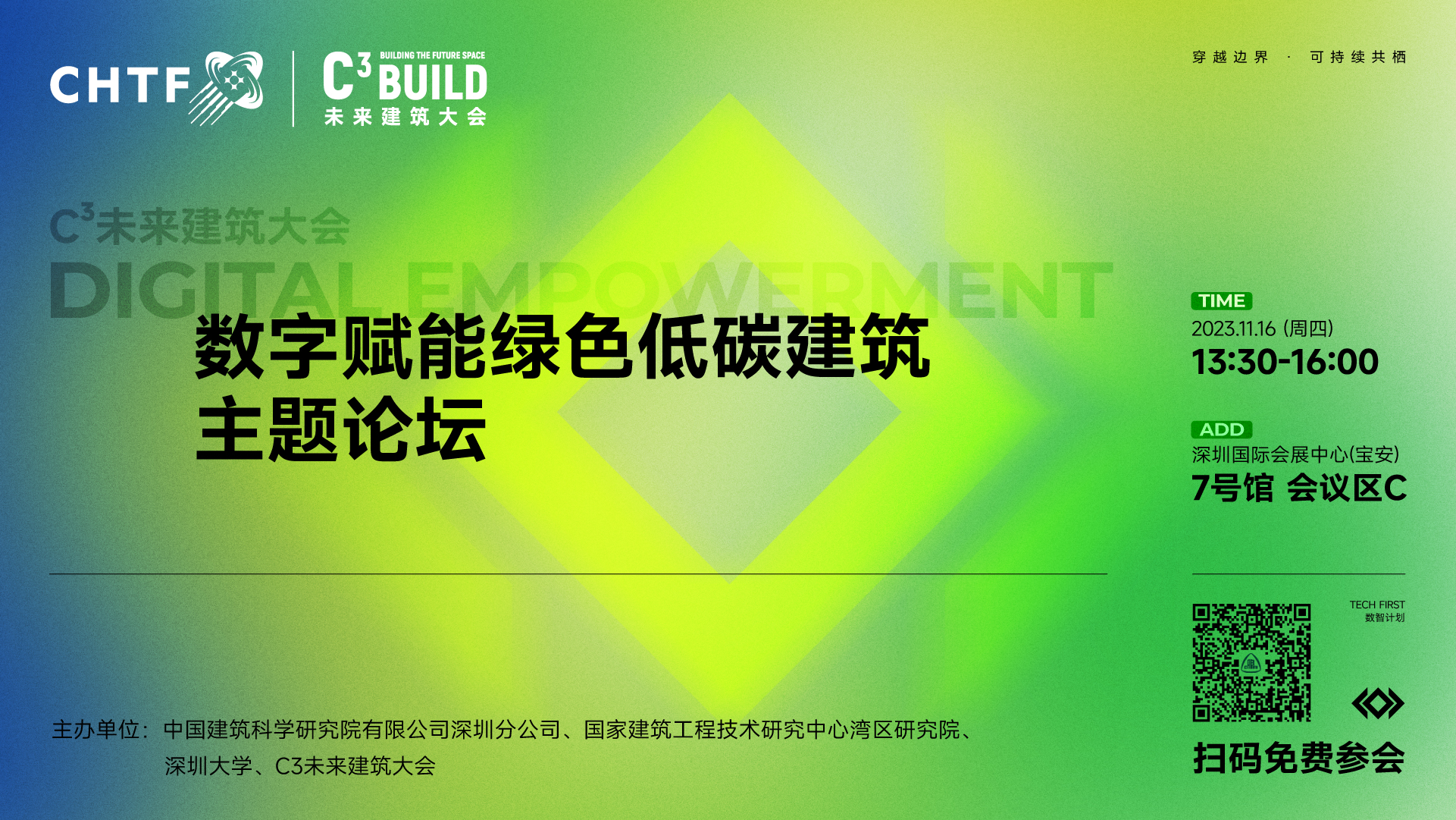 以新一代信息技術為代表的數字科技正在賦能建筑行業的創新發展,在實現碳達峰、碳中和目標的進程中,數字技術更是推進綠色低碳技術攻關,實現綠色建造、以人為本、智慧運維的重要手段。2023年高交會-C³未來建筑大會聯合中國建筑科學研究院有限公司深圳分公司、國家建筑工程技術研究中心灣區研究院、深圳大學,共同發起主題論壇“數字賦能綠色低碳建筑”。本次論壇將圍繞數字科技創新賦能城市綠色低碳發展開展研討,打造綠色創新平臺、匯聚綠色創新人才,助力國家雙碳戰略實施。